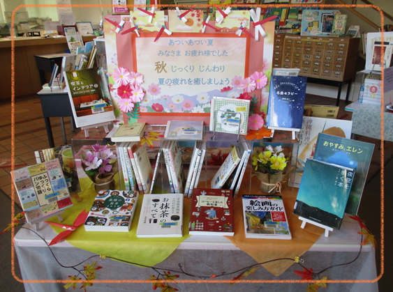 図書館1階には、夏の疲れを癒す 「秋 ヒーリング&リラックスに関する資料」 を